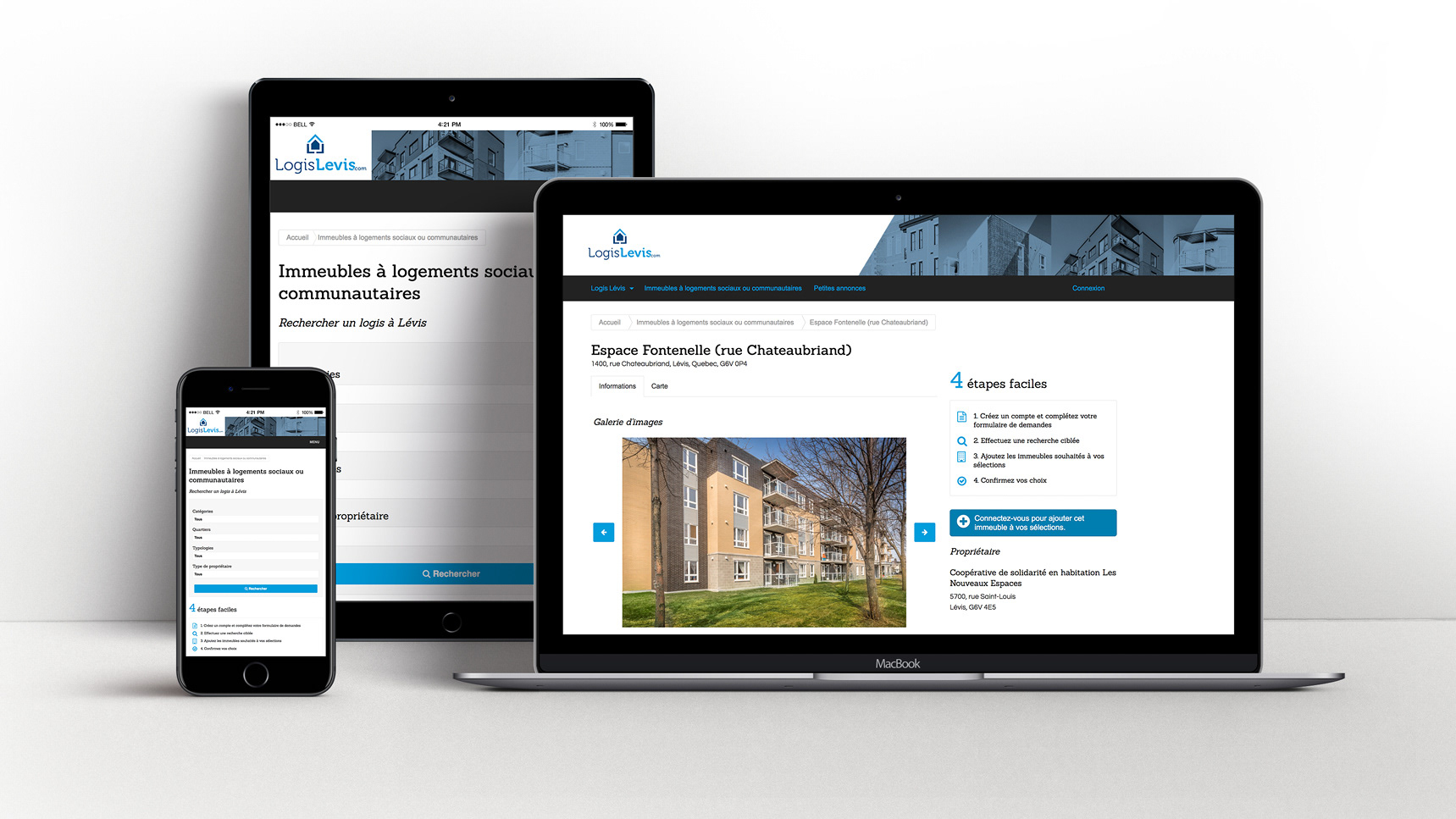 BCI a aussi mis sur pied un portail web, rassemblant en un lieu unique, l’ensemble de l’offre de logements sociaux et communautaires à Lévis. Un lieu offrant de l’information précise et compréhensible sur les divers types d’offres et permettant facilement de postuler pour obtenir un logement. BCI a créé l'arborescence et les plans d'interfaces détaillés et fait la conception graphique du site. Finalement, nous avons procédé à l'intégration ainsi qu’à la programmation optimisée pour une navigation Web conviviale.